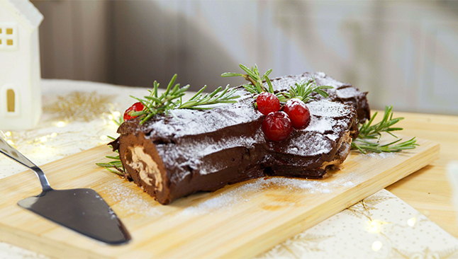 Vem decorado com motivos natalícios, como folhas de azevinho, bagas e açúcar em pó a imitar neve. É uma das sobremesas de Natal tradicionais que mais conquista os mais novos pelo sabor e pela aparência divertida.