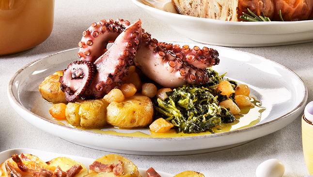 O Polvo à Lagareiro — com batatas, cebolinhas e grelos salteados — é uma das sugestões imperdíveis do chef André para o almoço da Páscoa. Ao servir, regue com um generoso fio de azeite virgem extra aromatizado com alho fresco picado e finalize com salsa picada para realçar os sabores.