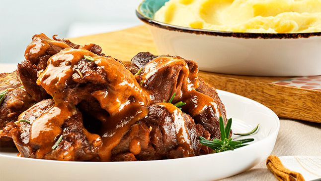 Bochechas de Porco em Vinho do Porto com Puré de Batata