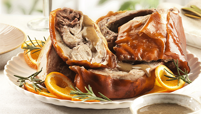 Para servir no almoço de Páscoa, leve ao forno durante alguns minutos para recuperar toda a crocância da pele. Acompanhe com batatas assadas ou uma salada fresca para equilibrar os sabores. Um prato perfeito para partilhar à mesa com família e amigos.
