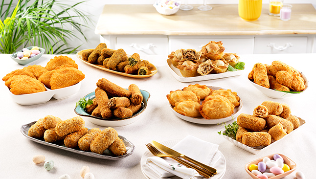 Comece por compor a sua mesa com os Croquetes 100% Carne de Bovino, os Rissóis de Camarão, os Rissóis de Amêijoa à Bulhão Pato e os Rissóis de Sapateira. Experimente ainda os Croquetes de Alheira com Maçã e os Pastéis de Bacalhau ou opte por uma opção vegetariana como os Crepes de Legumes.