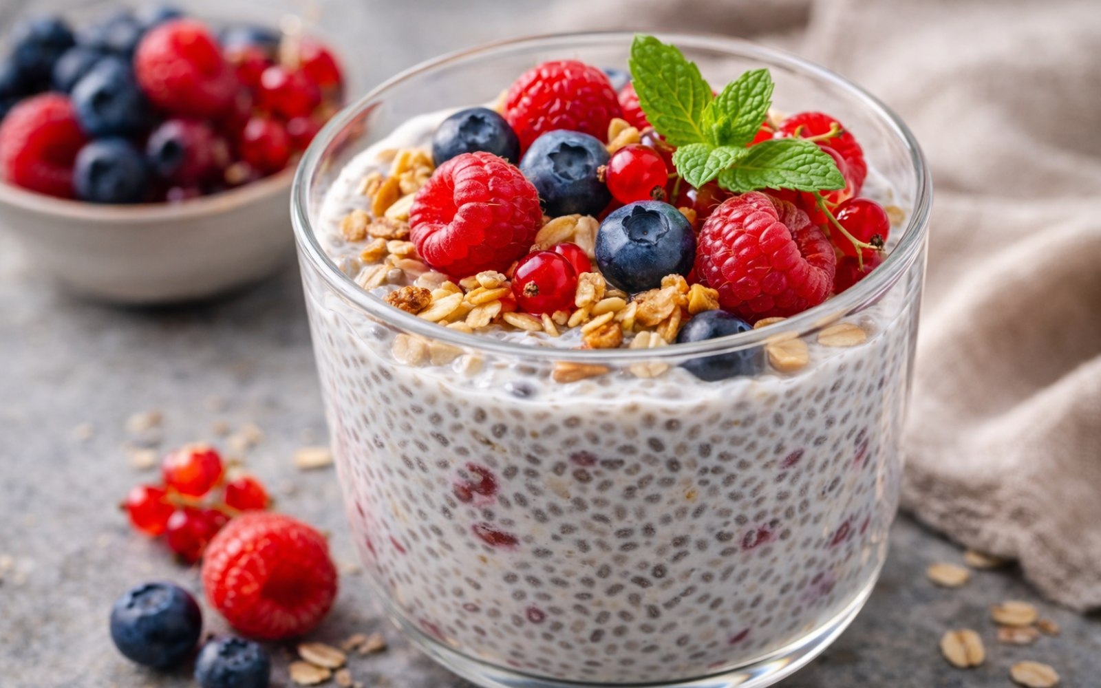 O pudim de chia é uma opção prática que se prepara na véspera. A chia é famosa pelo seu alto teor de fibra solúvel que, em contacto com líquidos, forma um gel no estômago, que contribui para o aumento da sensação de saciedade.