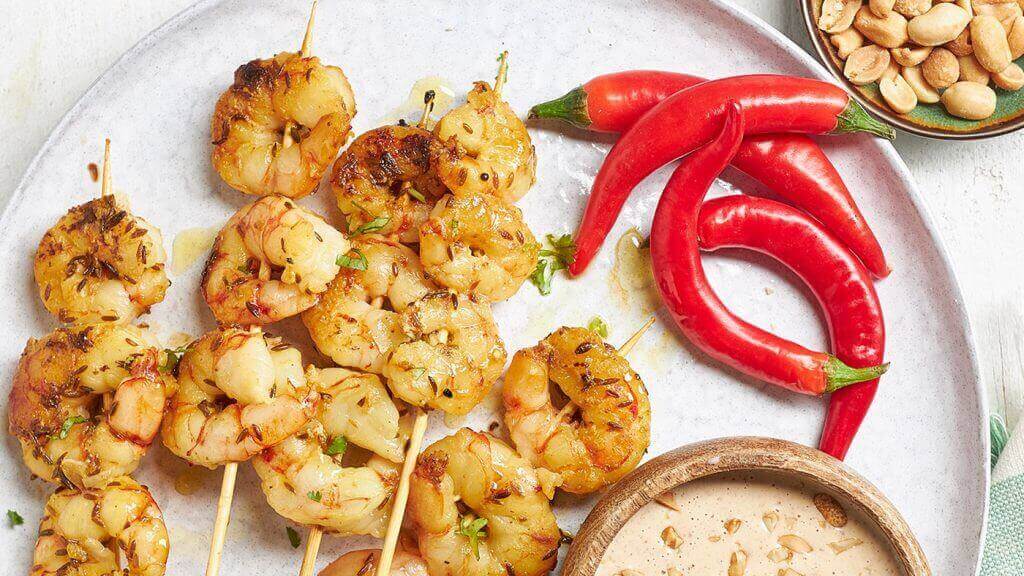 Espetadas de camarão com molho de amendoim