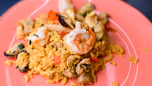 Tradicional da gastronomia espanhola, a paella é perfeita para um convívio entre amigos numa noite de verão ou para uma refeição em família após um dia de praia. É preparada à base de arroz, camarão, lulas e vegetais e é o toque do açafrão que confere ao prato o tão caraterístico tom amarelado.