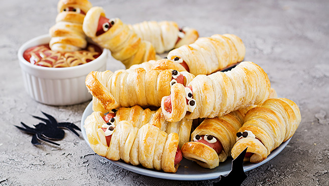 As múmias de salsicha são uma ótima sugestão de entrada para surpreender e assustar os convidados na noite de Halloween. Para isso, só tem de seguir esta receita de folhados de salsicha em forma de múmia. No fim, adicione umas pintinhas de mostarda para fazer os olhos e tornar esta entrada ainda mais assustadora.