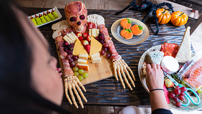 Surpreenda os convidados com uma tábua de enchidos e queijos arrepiante. Componha um esqueleto com uma seleção de enchidos e queijos a gosto. Disponha fatias finas de presunto de forma simétrica, a imitar o tórax. Para os braços e pernas, enrole linguiças ou salsichas. Para os dedos, use salame ou chourição.