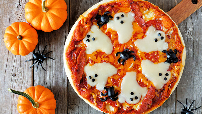 Faça uma pizza com azeitonas pretas para criar aranhas ou fantasmas com pedaços de queijo mozzarella. Desenhe teias de aranha com molho de tomate ou pesto e dê asas à criatividade com os ingredientes que tem na sua cozinha.