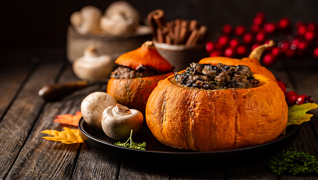 As abóboras são o principal símbolo do Halloween, por isso, não deixe de as incluir no menu. Sugerimos abóboras recheadas no forno com quinoa, queijo feta e nozes ou esta abóbora recheada com carne – duas receitas de Halloween salgadas fáceis de preparar.