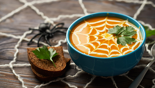 Este creme de abóbora é um prato delicioso e simples de preparar. Nesta receita, a abóbora é assada no forno para um sabor mais intenso e o crumble de bacon dá uma textura crocante. Distribua o bacon no topo para fingir que são minhocas ou larvas a rastejar pela sopa. Em alternativa, use natas ou leite de coco para desenhar uma teia de aranha.