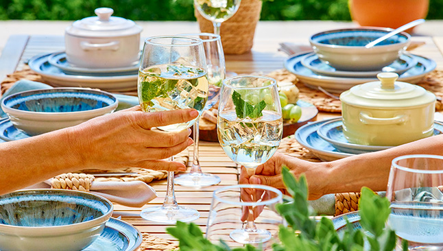 Água, sumos, sangria, cerveja e vinho são algumas das bebidas imprescindíveis num jantar de verão. Branco ou verde, o vinho sabe ainda melhor em copos delicados que realçam os aromas a cada gole.