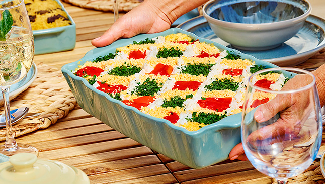 Este verão, opte por loiças em linha com a estação – com um toque artístico e artesanal. Resistente a riscos e com capacidade para manter a temperatura dos alimentos, a linha Reactive da Kasa tem pratos rasos, de sopa e sobremesa. Os pratos são de grés, em tons de azul reativo, meio esverdeados, com um design único. Se preferir algo mais sóbrio, a linha Grândola em branco adiciona um toque de charme à sua mesa.