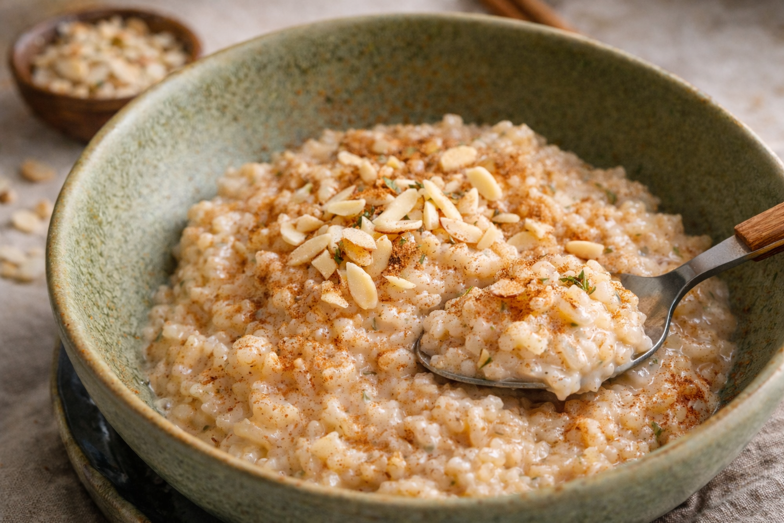 Na hora de servir o arroz doce, decore com amêndoa palitada e polvilhe com canela em pó.