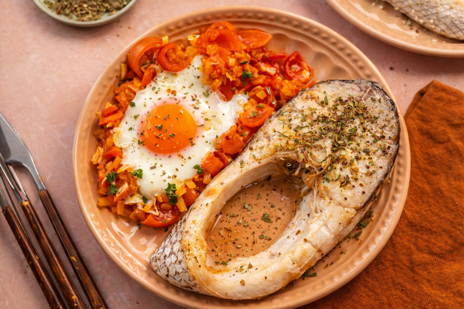 Sirva as postas de bacalhau com cebola e alho e rodeie com as batatas. Tempere com pimentão-doce e salsa picada a gosto.