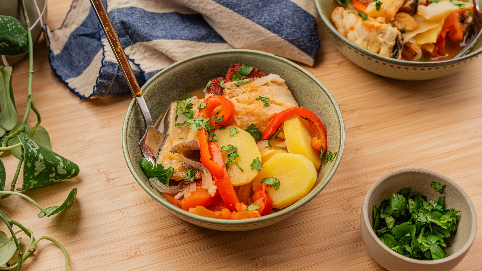 Sirva o bacalhau assado no forno com a batata e decore com orégãos frescos.