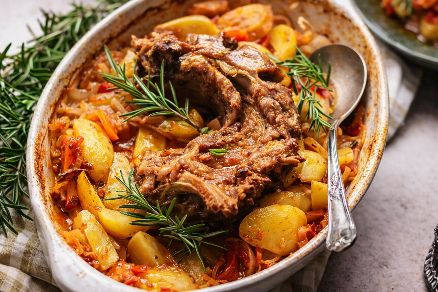 Coloque o cabrito sobre as batatas e regue com a marinada.