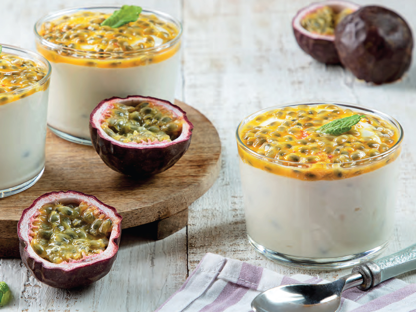 Noutra taça, bata as natas até obter picos firmes. Adicione a polpa de 3 maracujás e envolva novamente.