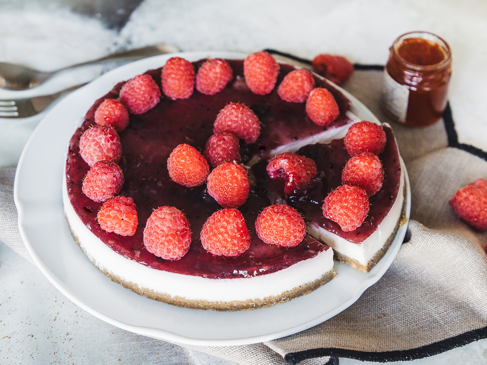 Assim que tiver solidificado, desenforme para um prato e decorre com framboesas frescas, flores comestíveis se quiser e coco ralado. Sirva fresco.