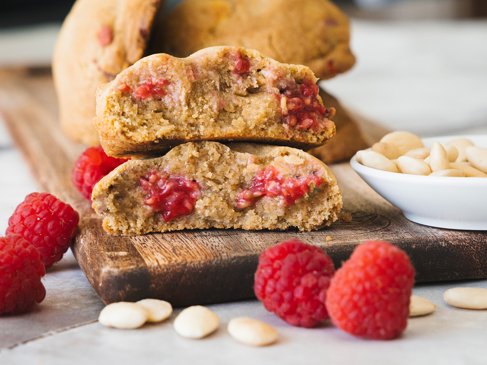 No mesmo robot de cozinha, adicione o caju já escorrido e triture novamente bem. Junte o sumo de limão, o restante óleo de coco, as framboesas congeladas, o extrato de baunilha, o leite de coco e o xarope de agave. Triture até obter um creme homogéneo.