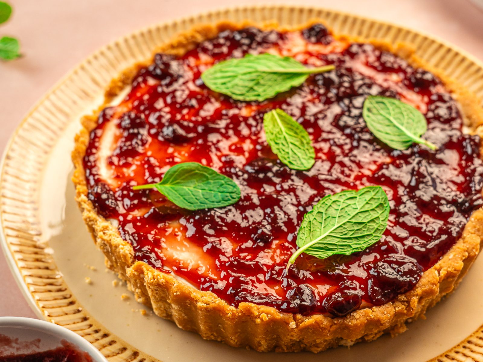 Coloque este preparado sobre a base de bolacha e leve ao frio de um dia para o outro. Quando estiver sólido, cubra com a compota e a hortelã.