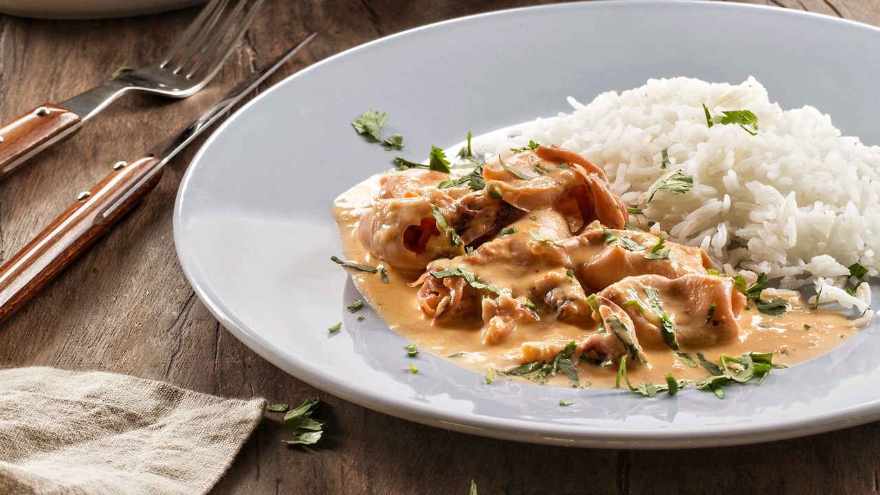 Retire do lume, sirva de imediato e polvilhe coentros picados.