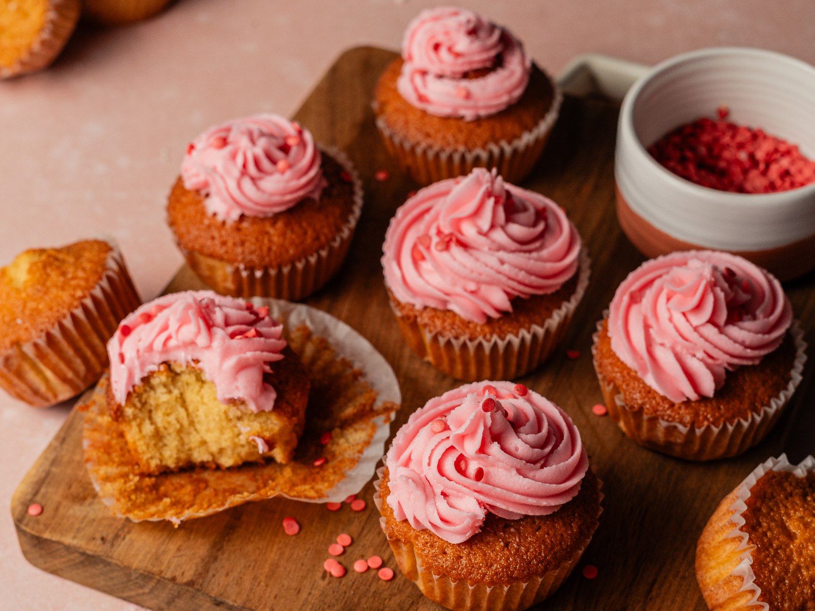 Junte o leite e a baunilha até que fique homogéneo e cremoso. Adicione corante rosa e coloque num saco pasteleiro de boca larga.