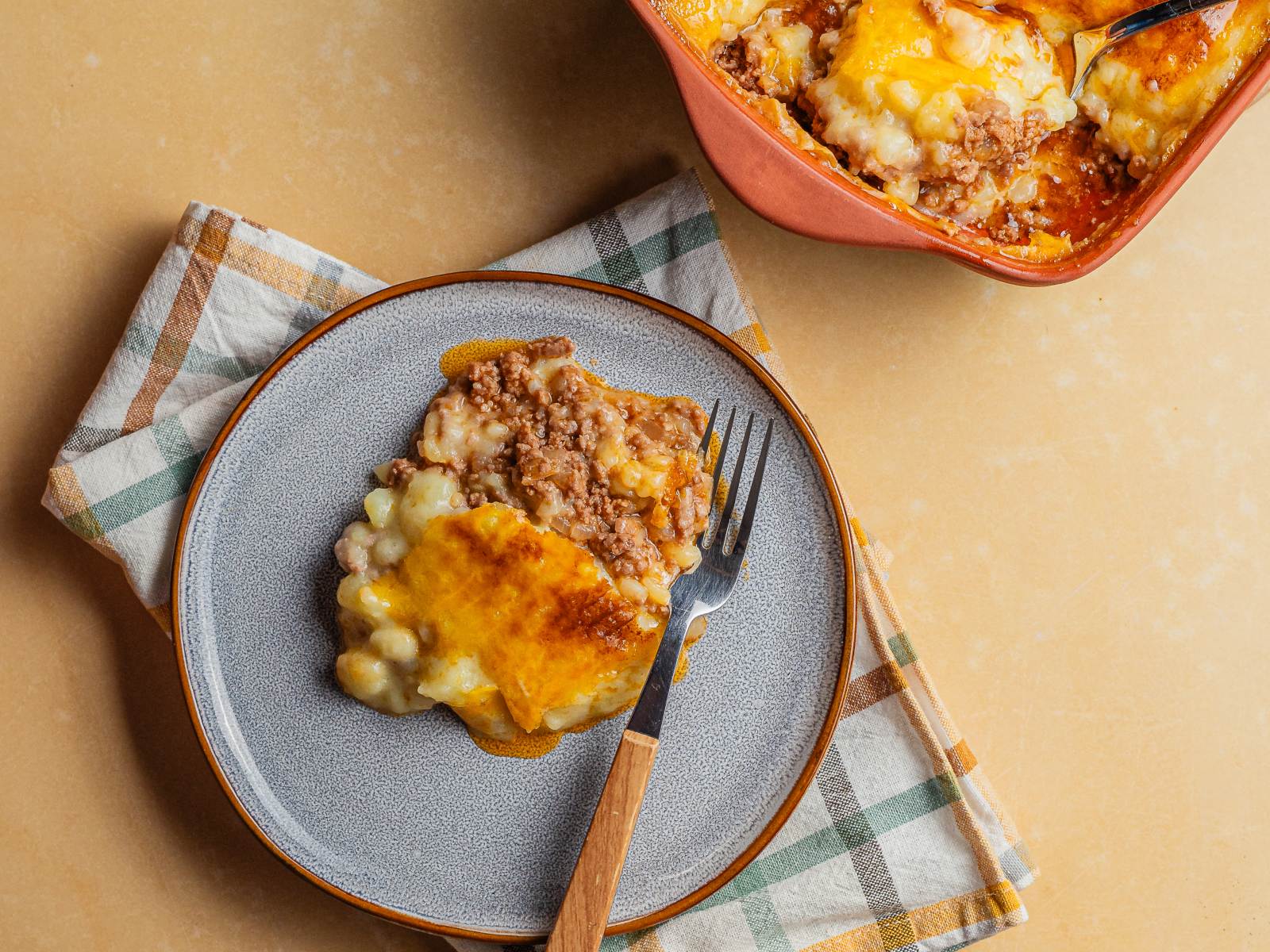 Disponha numa travessa, alise a superfície e cubra com puré de batata. Alise novamente, pincele com gema de ovo batida e faça desenhos com um garfo. Leve ao forno a 180ºC por 15 a 20 minutos ou até dourar.