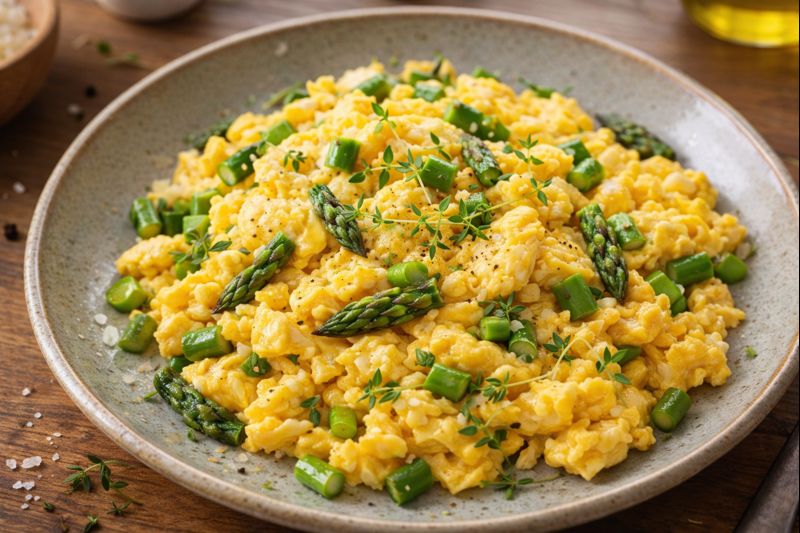 Usando uma espátula, comece a mexer os ovos suavemente, juntando os espargos enquanto eles cozinham. Continue a mexer até os ovos estarem no ponto desejado (cremosos ou mais secos), geralmente por 1 a 2 minutos.