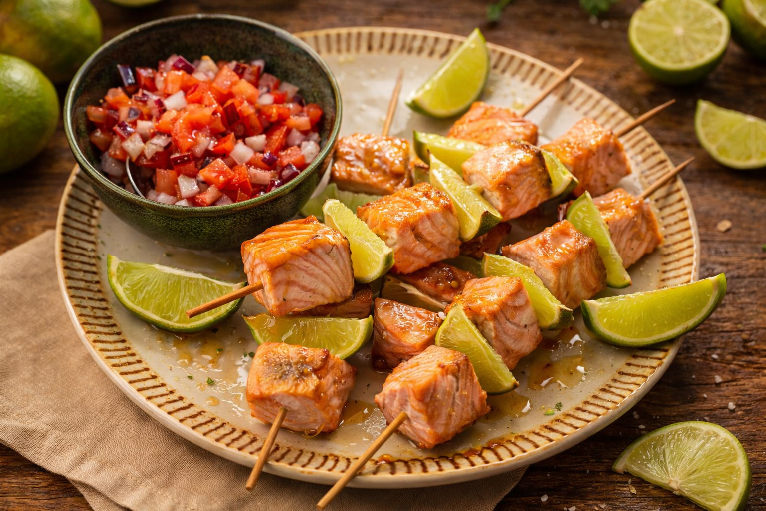 Sirva as espetadas de salmão acompanhadas com o pico de gallo.