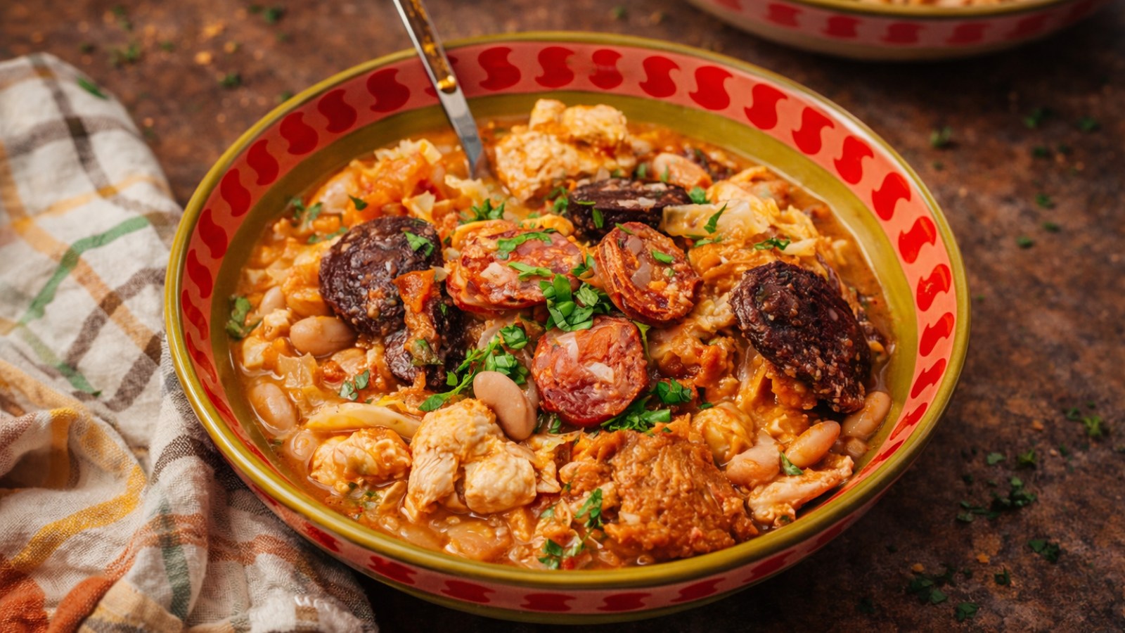 Retire do lume e sirva a feijoada de enchidos, polvilhada com coentros picados.