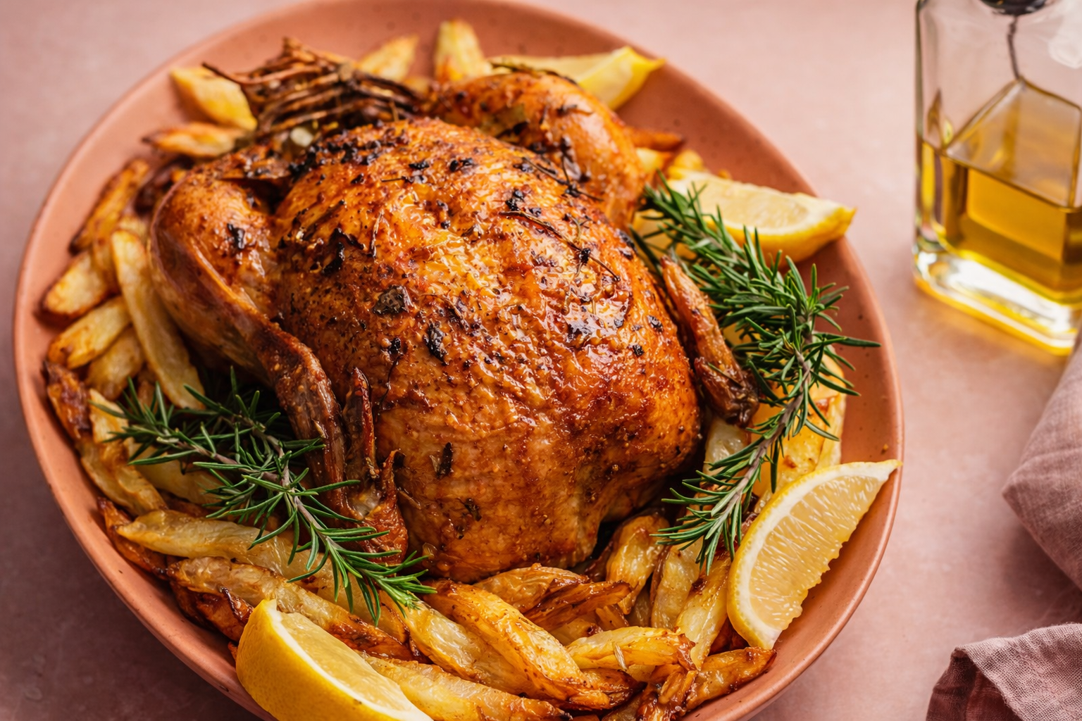 Sirva o frango assado com limão juntamente com as batatas assadas no forno. Decore com rodelas de limão e mais alecrim.