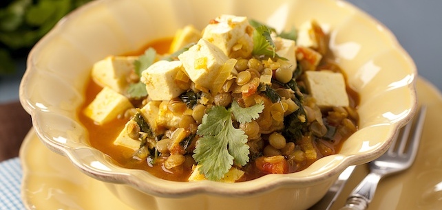 Retifique temperos, retire do lume e adicione o tofu. Envolva bem e decore com as folhas de coentros reservados.