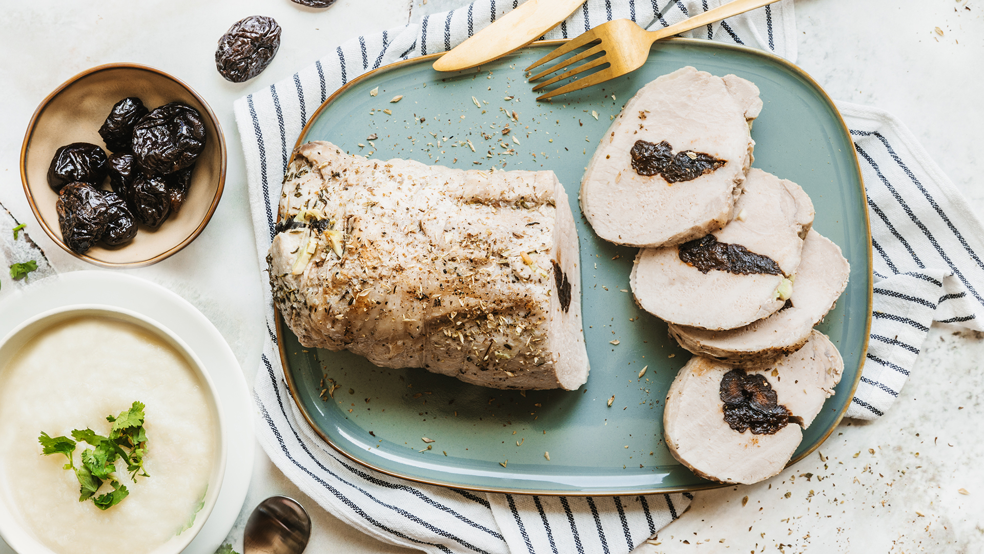 Faça uma cama com folhas de alecrim num tabuleiro. Faça uns cortes no lombo e coloque-o no tabuleiro também. Nas aberturas coloque as ameixas pretas. Regue com a marinada e adicione um pouco de vinho e alecrim. Junte um pouco de margarina e regue com um fio de azeite. Leve ao forno durante 30 minutos.