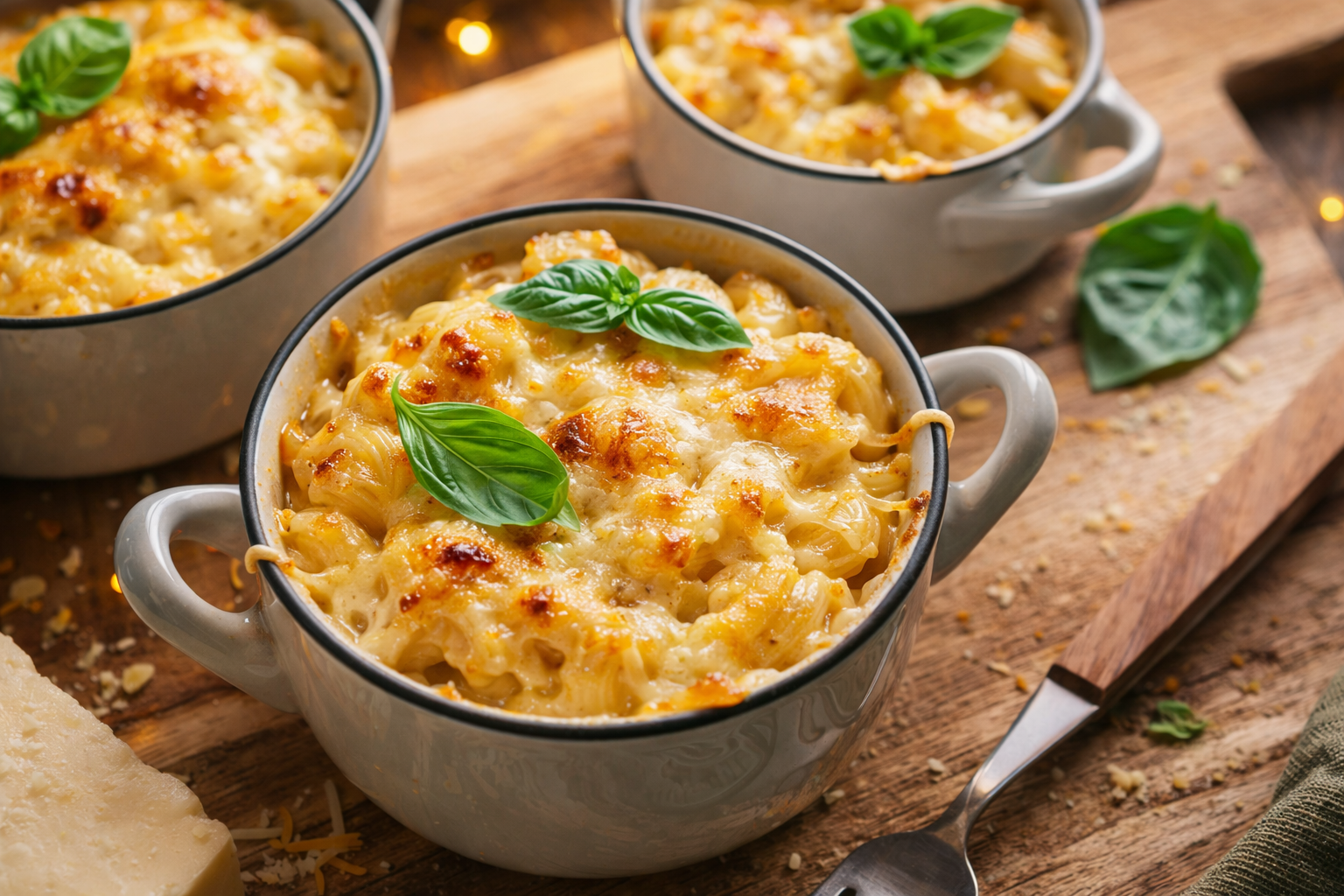 Sirva o Mac and Cheese e decore com manjericão fresco.