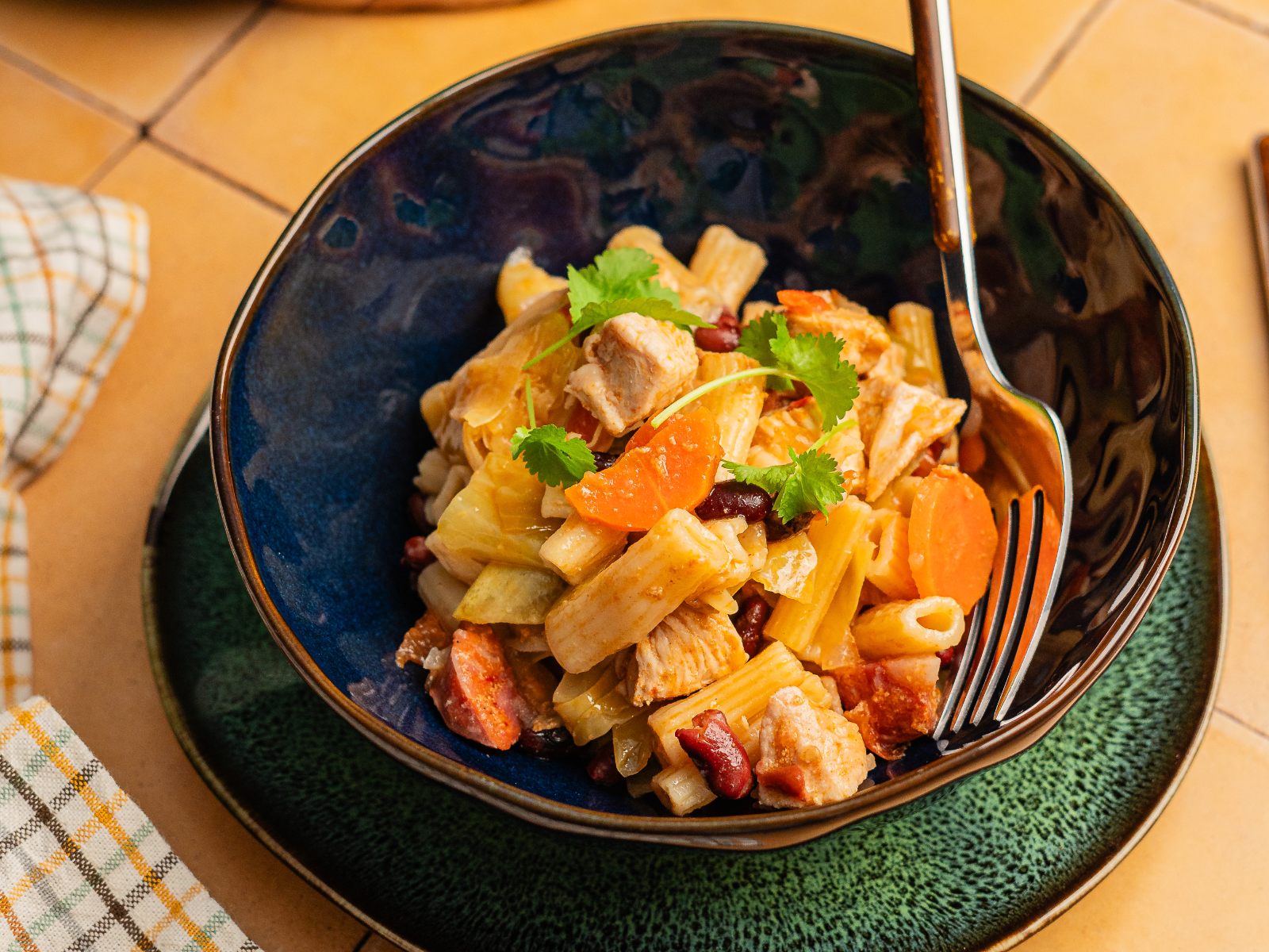 Quando os legumes estiverem prontos, junte o macarrão cozido e escorrido.