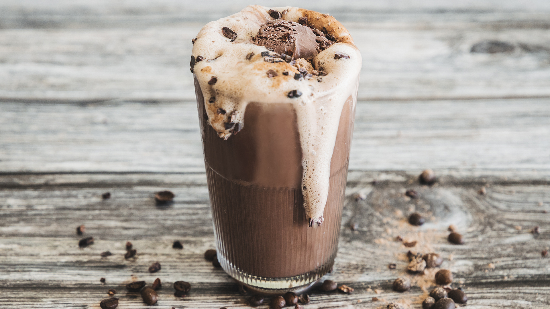 Adicione os frutos congelados, cubos de gelo e a hortelã e triture até ficar homogéneo.