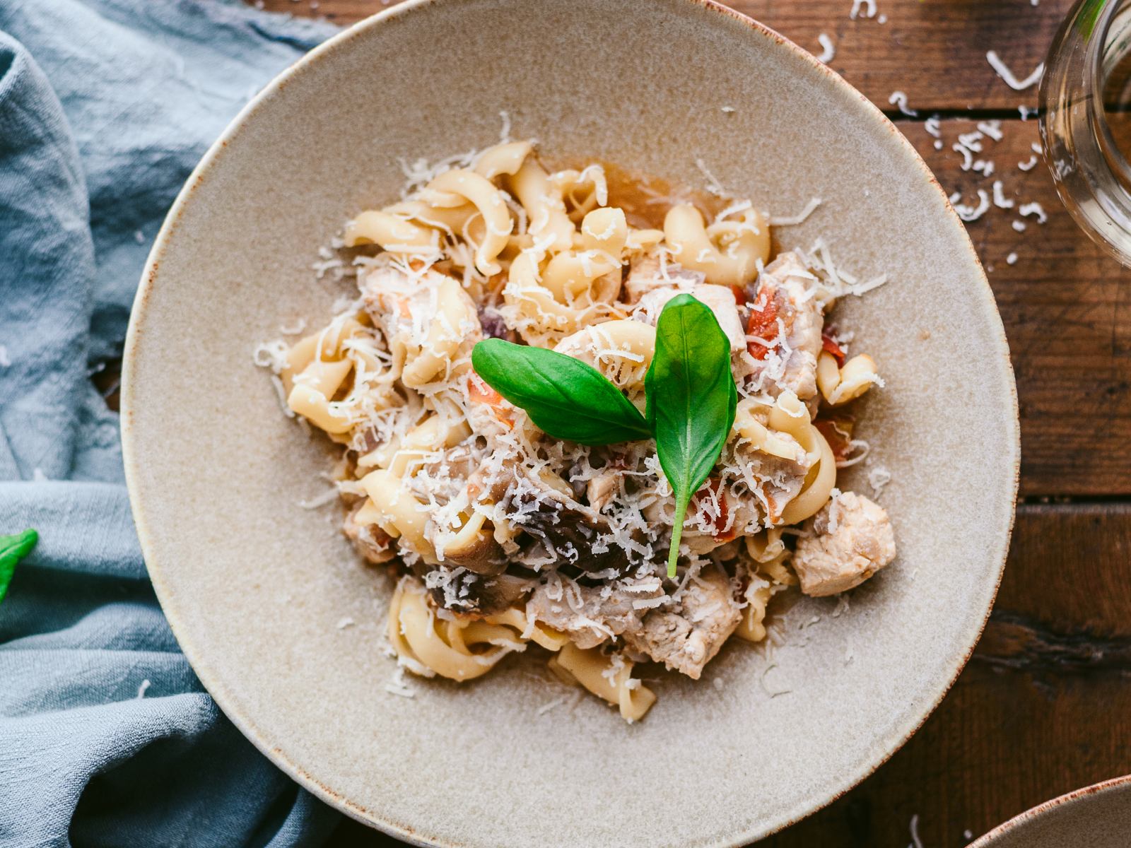 Depois da massa cozida, escorra e junte ao refogado. Envolva a massa no molho e sirva-a polvilhada de queijo parmesão ralado.
