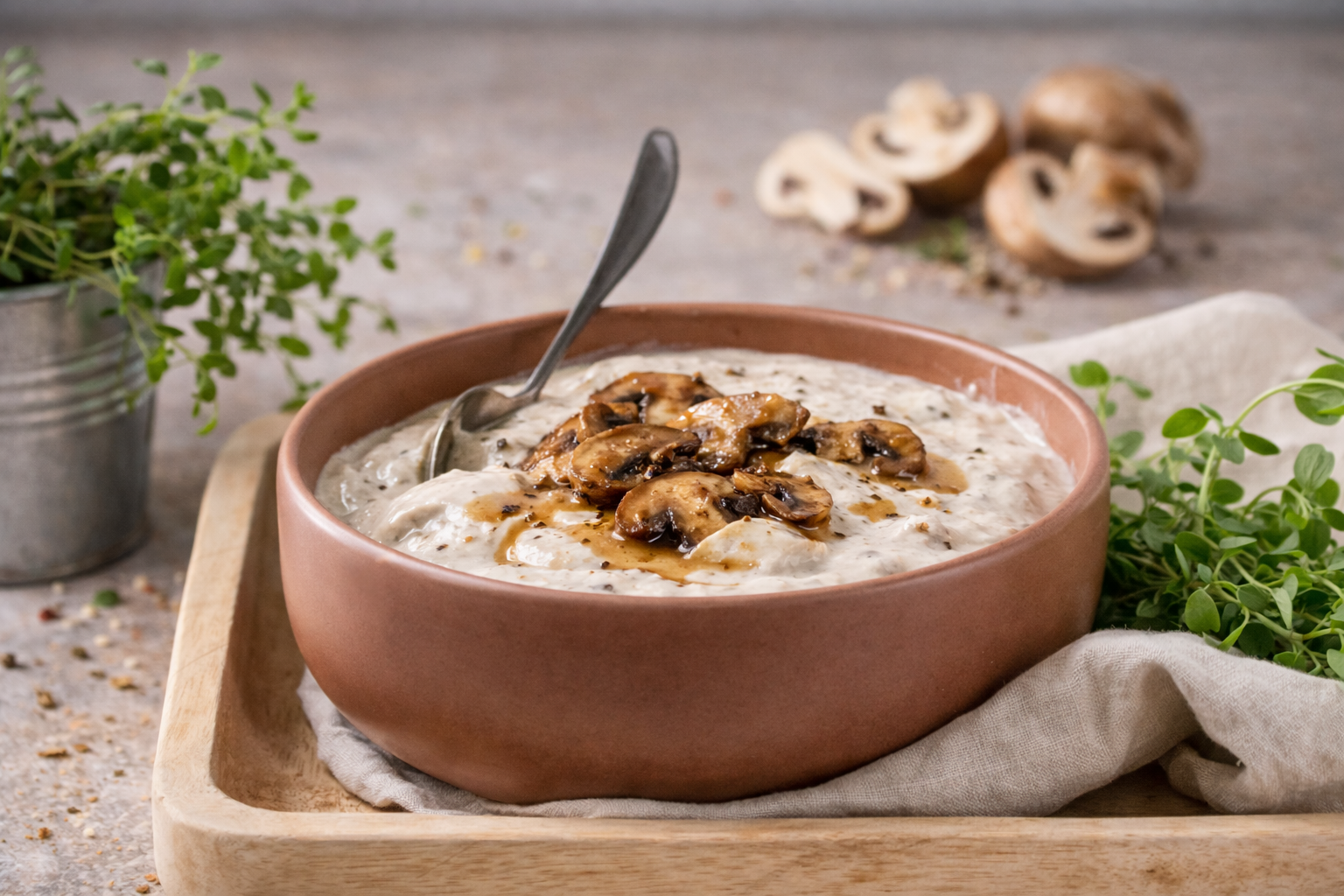 Noutro tacho, coloque a manteiga, a cebola picada e os cogumelos picados. Deixe caramelizar e vá mexendo para não colar.