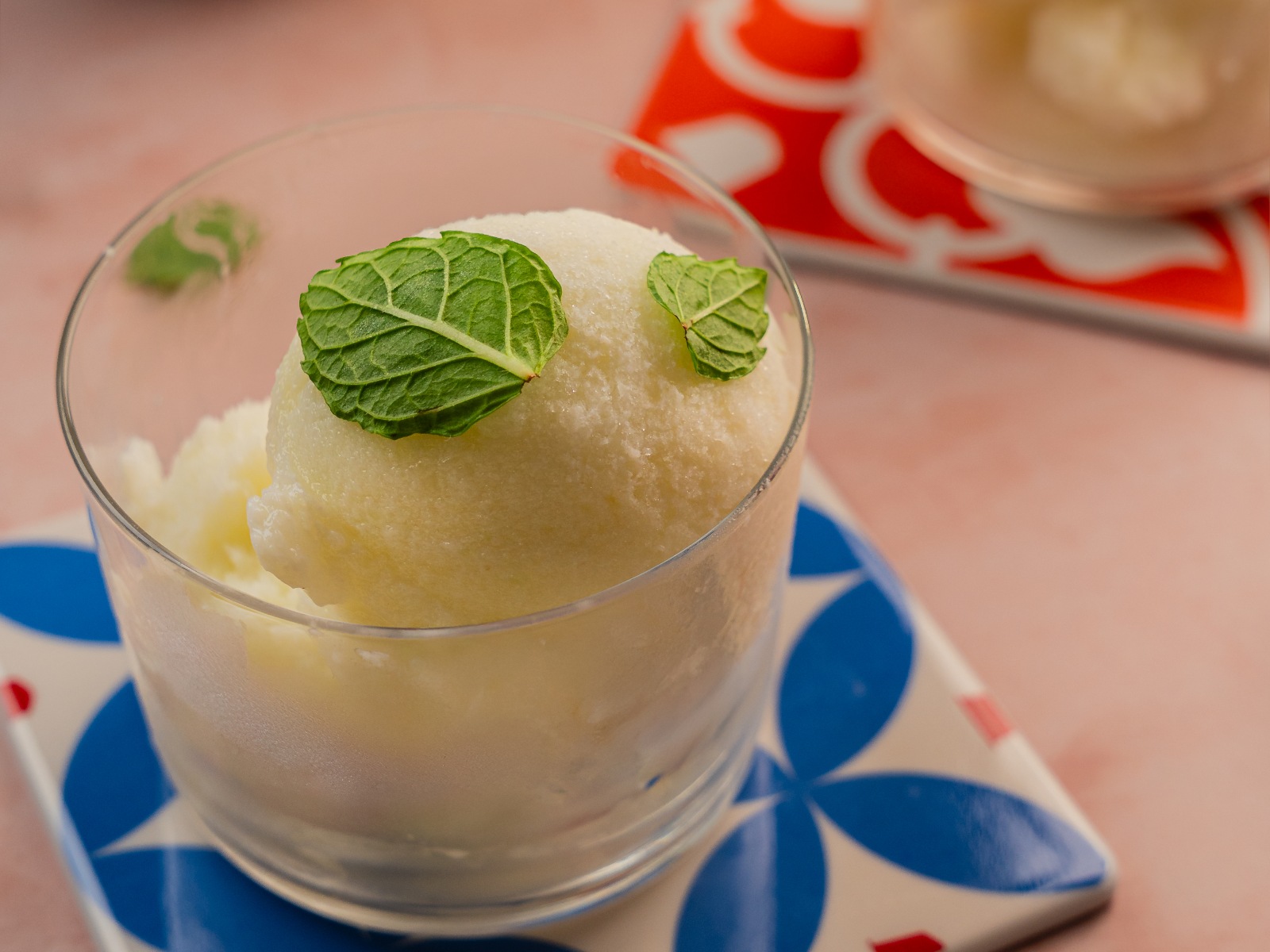 Sirva a mousse de melão com cubinhos de melão e folhas de hortelã.