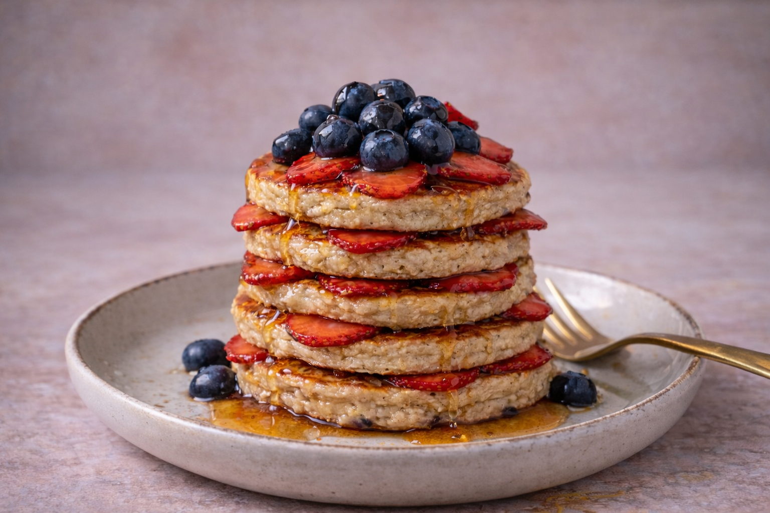 Passe as panquecas para um prato e faça uma torre de panquecas de aveia.