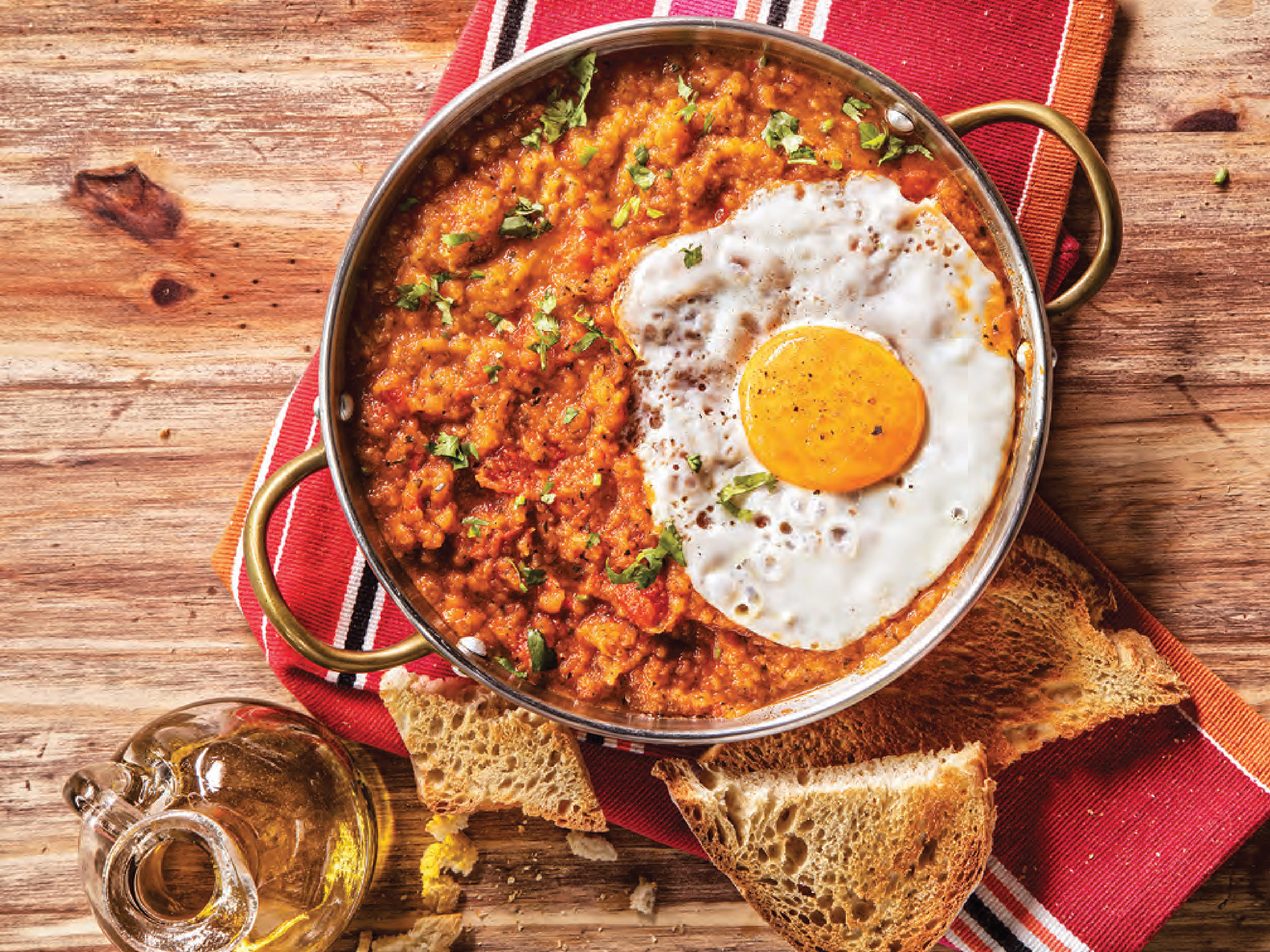 Aqueça o azeite numa frigideira e refogue as cebolas laminadas e o louro.