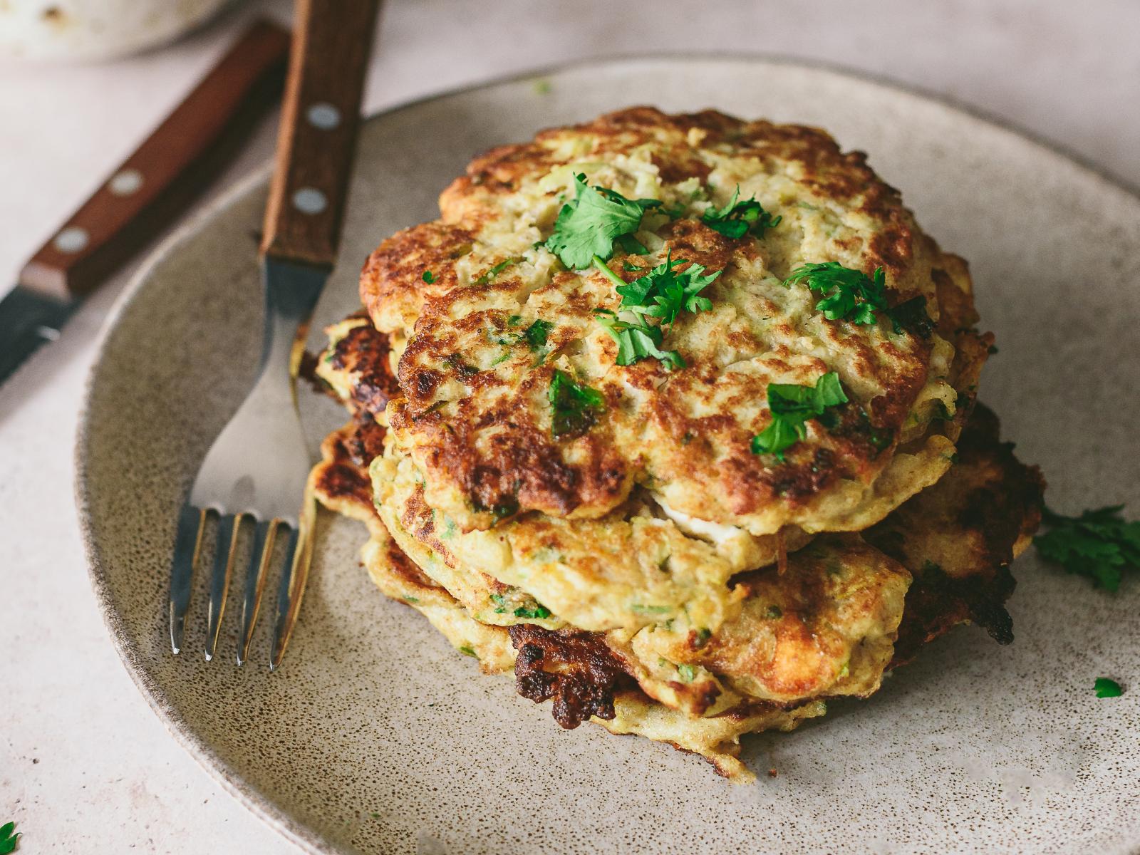Sirva as Pataniscas de curgete com a salada de abacate e tomate. Rectifique temperos se necessário.