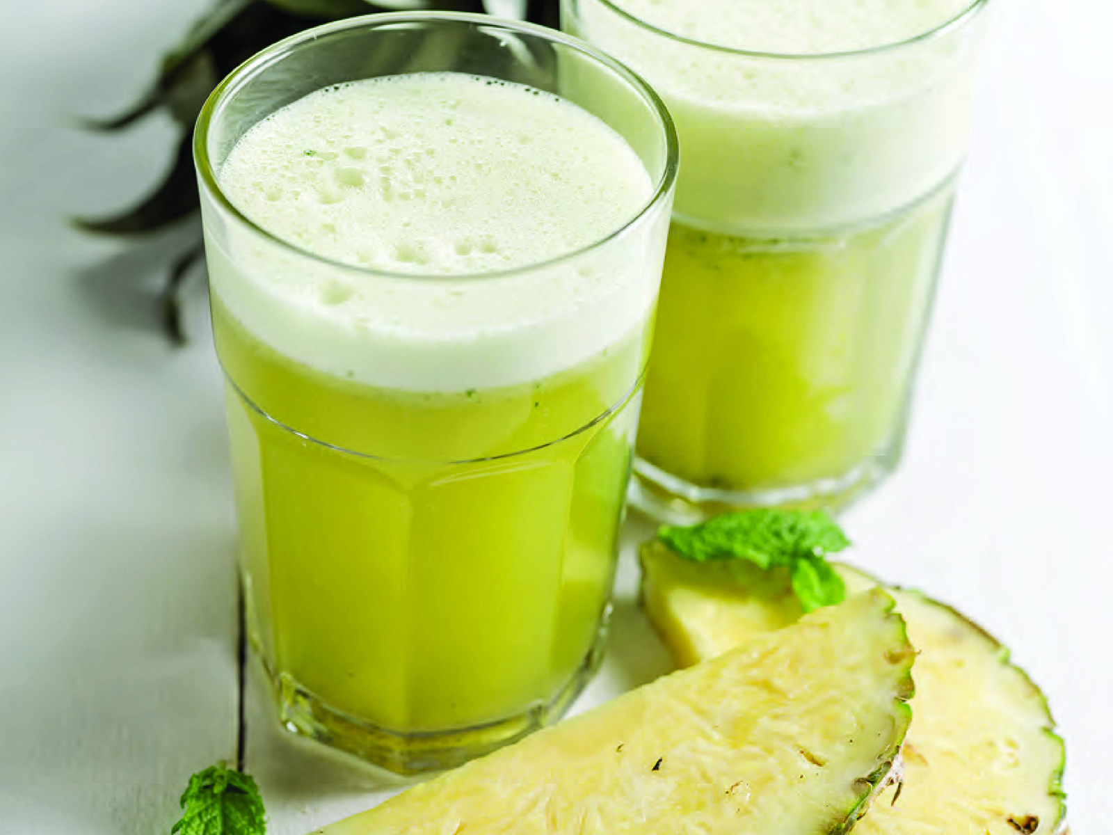 Colocar em copos altos e servir de imediato, decorado com triângulos de abacaxi.