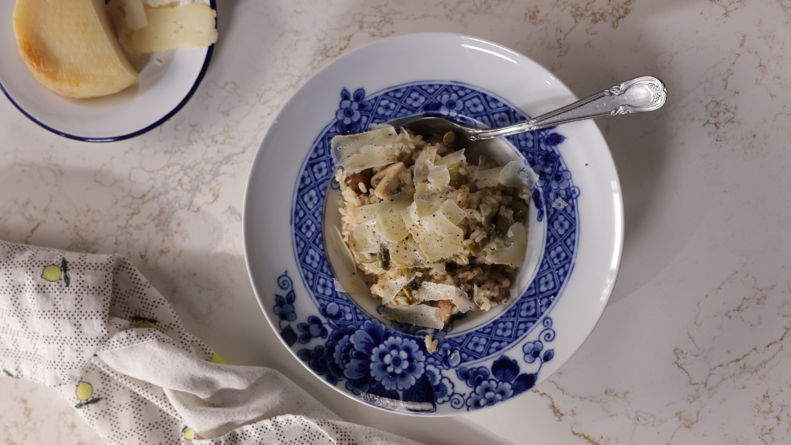 Misture os espargos e as ervilhas no fundo da forma e coloque o queijo de cabra em pedaços. Reserve alguns espargos e ervilhas.