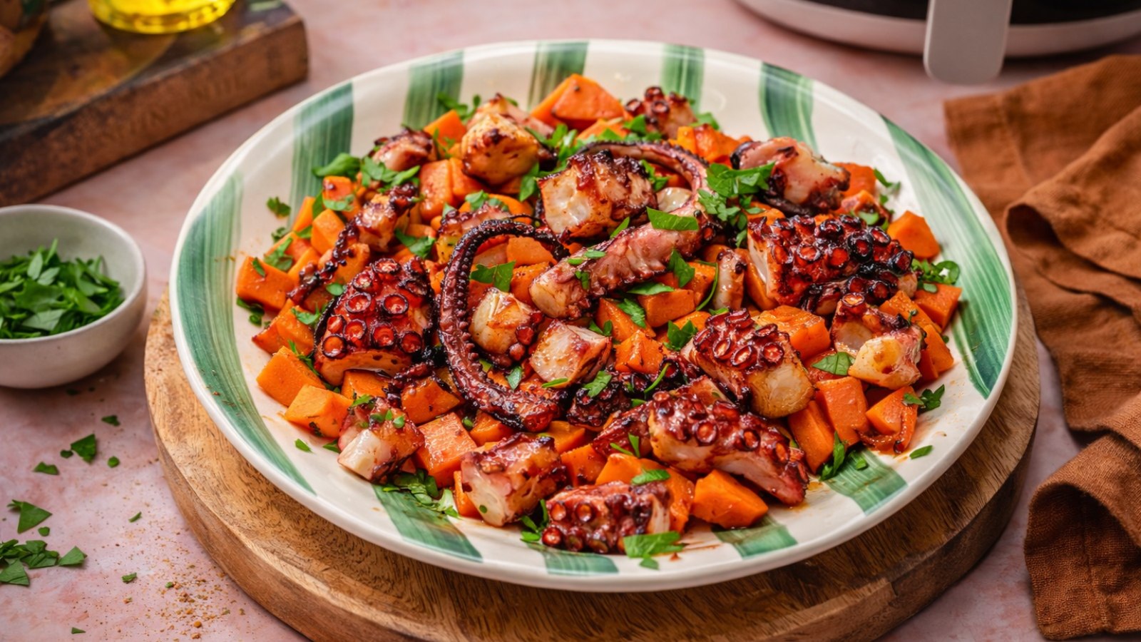 Sirva o risoto de polvo decorando com os tentáculos do polvo por cima e polvilhando coentros picados.