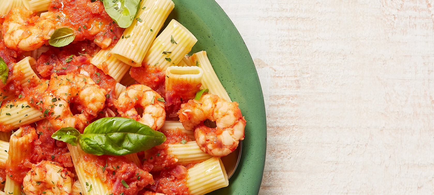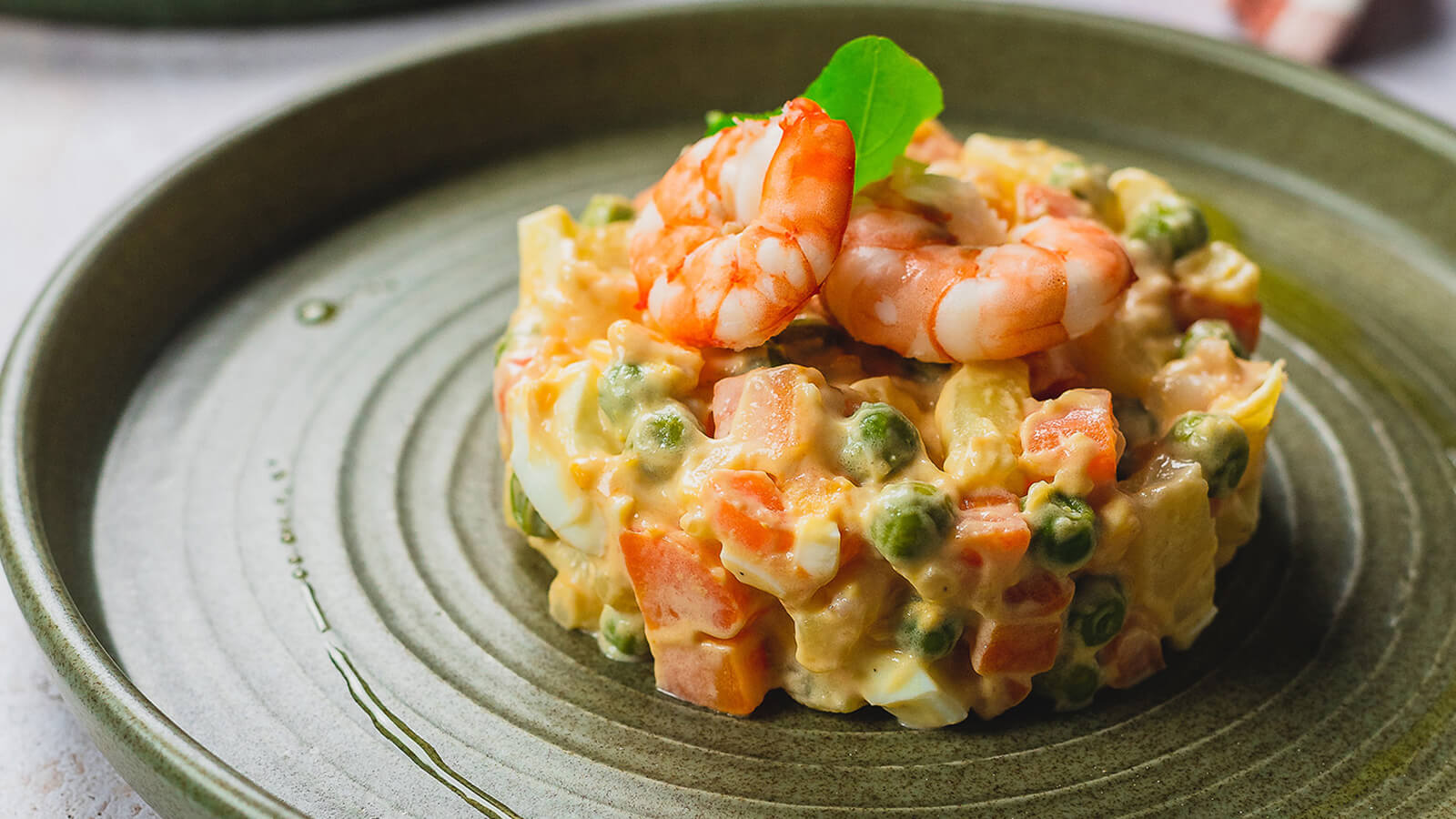 Sirva a salada russa usando um aro decorativo, decore com camarões inteiros e folhas de manjericão.