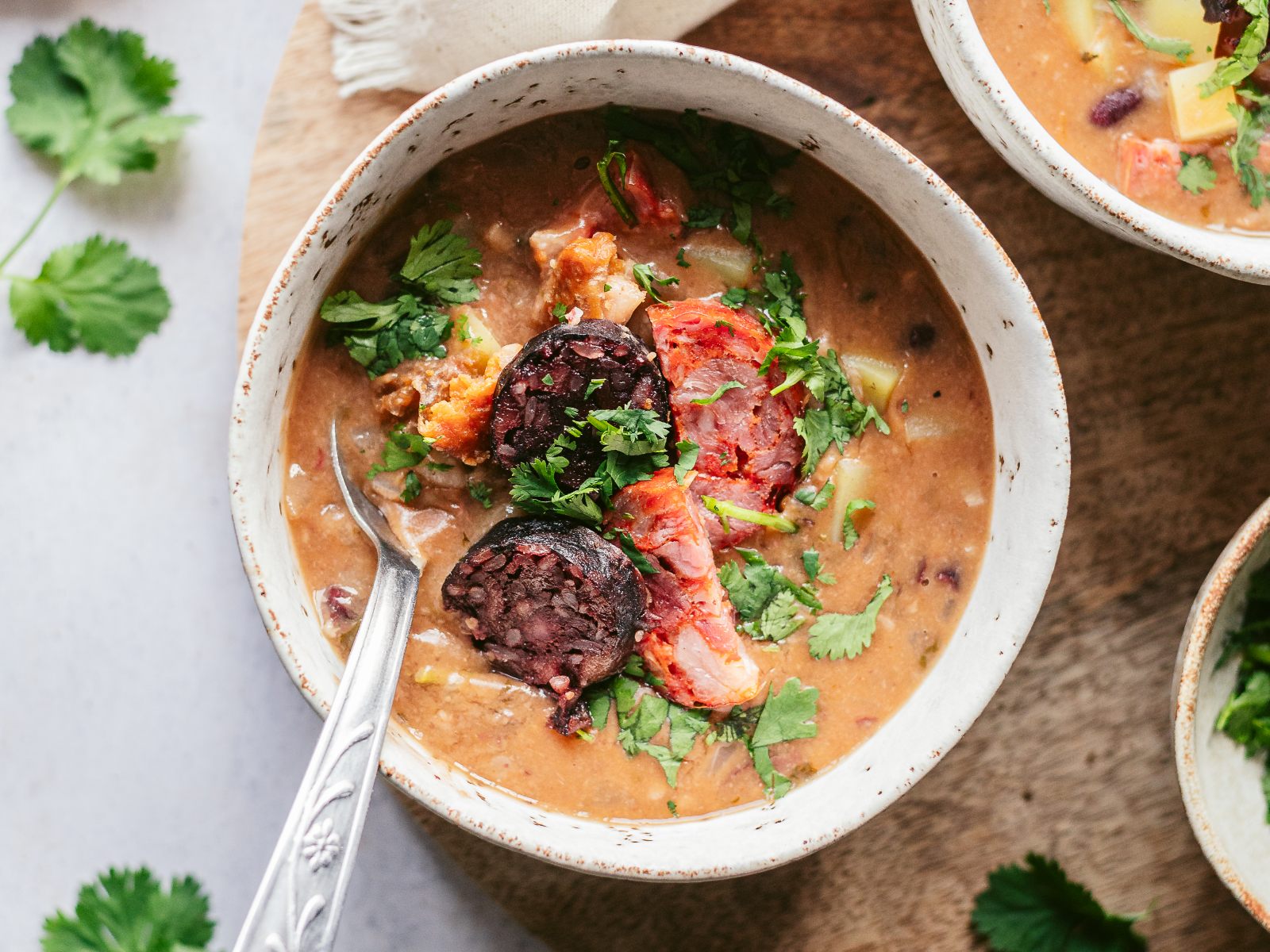 Cubra com água e coloque um ramo de coentros, dois dentes de alho esmagados, a folha de louro, 1 cebola em metades e tempere com pimenta preta. Deixe cozinhar em lume brando durante 45 minutos, com o tacho tapado. Retire os enchidos ao fim deste tempo.