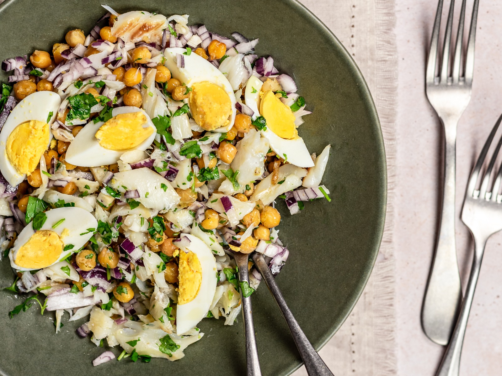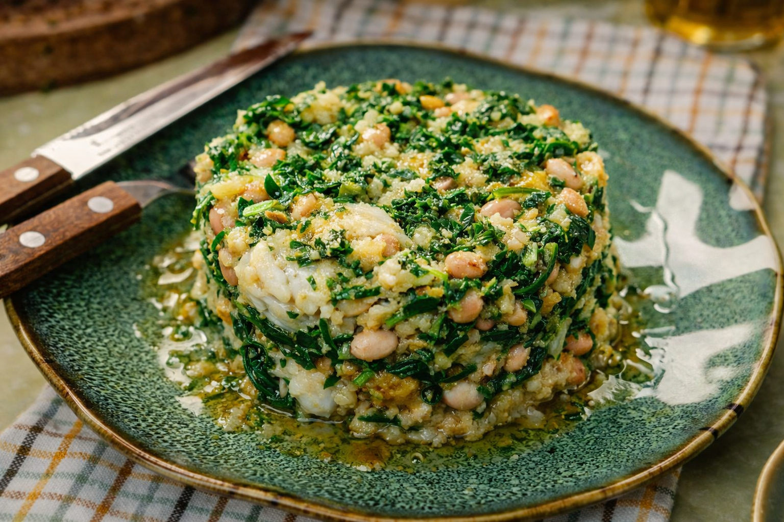 Retire do calor e junte às lascas de bacalhau, parte do queijo e as gemas. Tempere com sal, pimenta e noz-moscada.