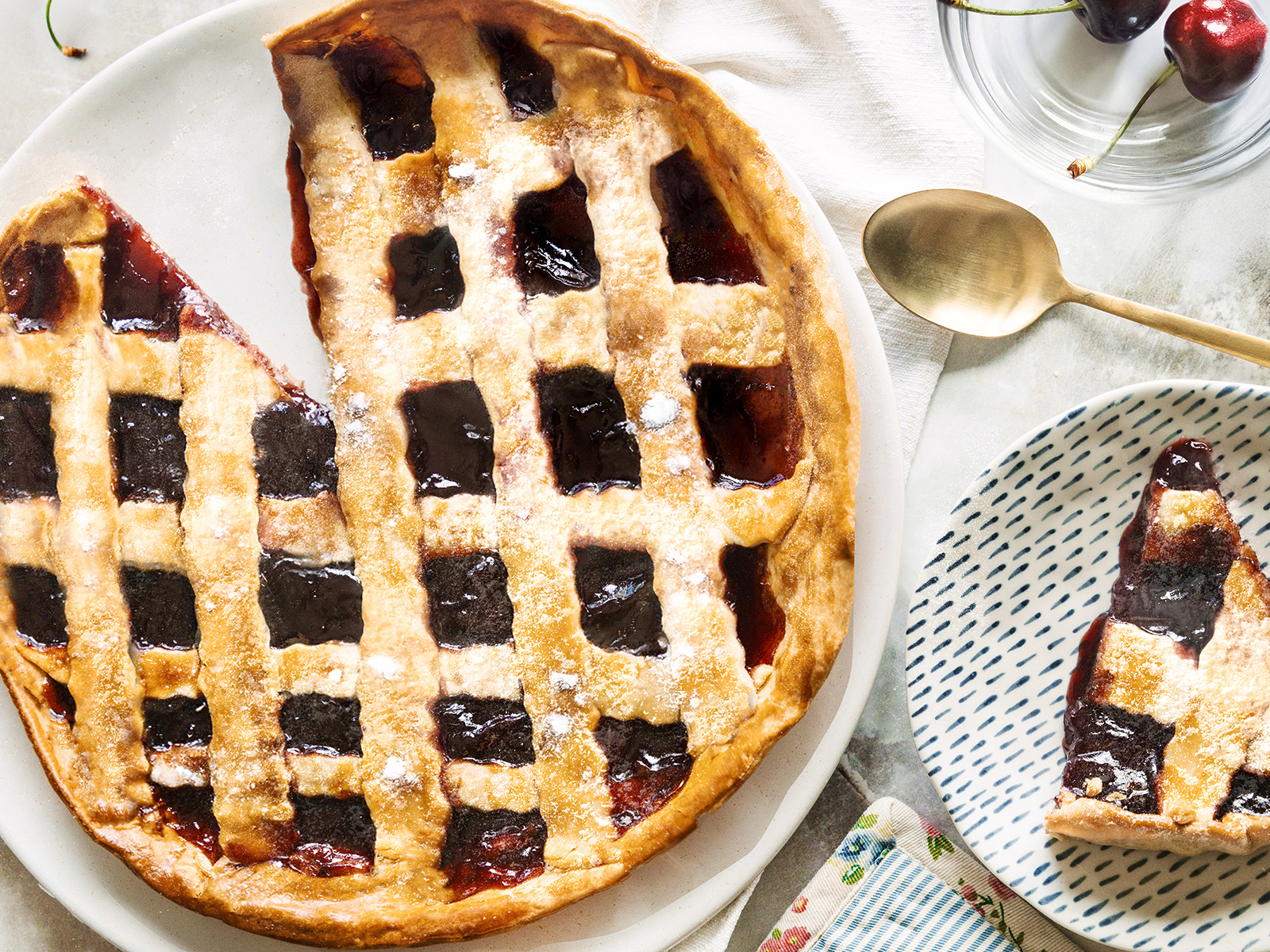 Recheie a tarte com o mistura das cerejas. Disponha mais cerejas frescas por cima. Cubra com a 2ª folha de massa.