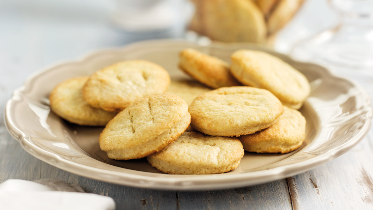 Corte as bolachas com o copo de medição, coloque‑as num tabuleiro forrado com papel vegetal e leve ao forno durante cerca de 20 minutos.