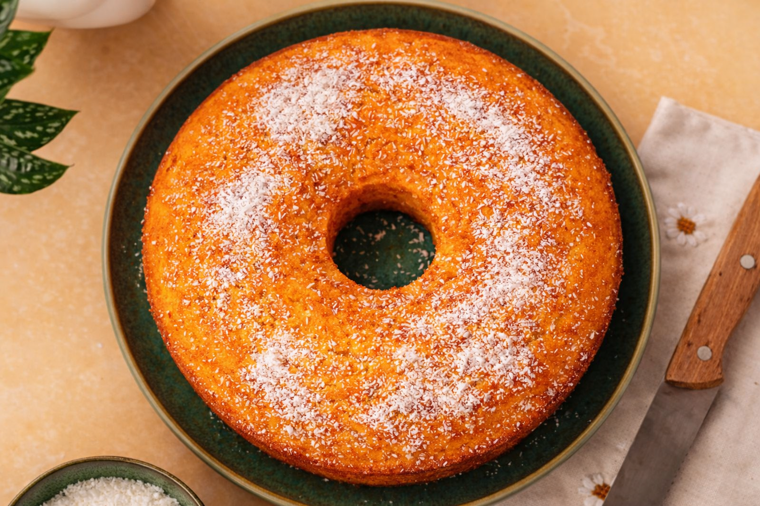 Envolva com a espátula e deite a massa numa forma de bolo inglês ou redonda com buraco, untada com manteiga e polvilhada com farinha. Leve ao forno durante 30‑35 minutos.